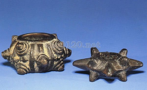 ともに扇円体,1点は表面に12個の突起がつき,もう1点は表面に12個の錐形の角がつき出ている。中央に銎があり,棒をさしこむ。出所:中国内蒙古北方騎馬民族文物展