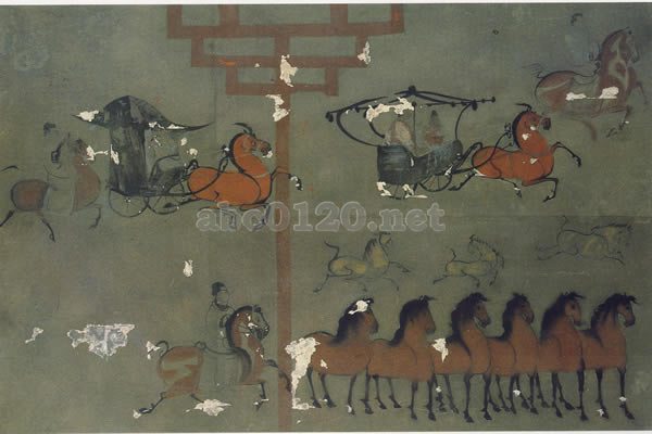 上部に車2台,騎馬2頭が描かれている。右上すみに先導の騎馬が1頭,馬は黄褐色,騎者は黒いかぶりもの,白衣,白い大滑(馬の背に敷く皮)。その後ろは軺車(立ち乗りの小車),たてがみを切りそろえた紅褐色の馬を駕し,乗者は車の後ろに立ち(頭部は剥落),御者は軾のそばに坐す。その後ろは輜車(ほろのついた車),たてがみを切りそろえた紅褐色の馬を駕し,乗者はほろの中に坐す。前事の馬は首をもたげ蹄をあげ,御者の御しかたは手慣れて思いのままの様子である。後者の車輪や車体は,確かな輪郭の線,熟達したタッチによって,いかにも駆動している感じがでている。事の後ろに従騎が1騎。下部には,一人の牧人がたてがみを切りそろえた黄褐色の馬にまたがり駆けるさまを描いている。牧人の前に,たてがみをたらしたたくましい駿馬が6匹,みな耳を立て,頭をあげ,胸をはって立っている。ほかに気の荒い若駒が3匹,みな淡黄色に塗られている。前の一駒は尾を立て下を向き,全速駆け足で疾駆し,中間の一駒は首をめぐらし蹄をあげ,後ろの仲間を呼び,後ろの駒は頭をあげ尾をふりあげて駆け,前の仲間に追いつこうとしているようである。わずかな筆の線で,若駒の活発で天真な性格を描きだし,また若駒のきかん気で奔放な動きのある表情をも表わしている。この牧馬図に描かれた草馬は構図がきっちりとむだがなく,色彩は落ち着きがあり調和がとれている。人馬の形象は外形,表情兼ね備わり,生気にあふれている。ここに生活を観察し表現する古代芸術家の創作能力を看取することができる。出所:中国内蒙古北方騎馬民族文物展