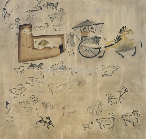 羊の群を放牧する広場に小さな砦が描かれる。その壁には榜題が書かれ,砦の中に穀物の山積みがある。羊の群はうずくまり,立ち,ふり向いて望み,哺乳し,歩き,その姿態はさまざまである。巻き角の羊が一番先に立って先導し, 3匹の羊番の犬が群に従っている。群の後ろに男女らしい牧人が2人いる。群の前方に2人が乗る馬車があり,馬は蹄をあげ駆けている状を示す。造型は生き生きとし,少ない筆で巧まず表現され,線は流れるように柔らかく奔放で,色調は調和がとれ,生活感にあふれている。出所:中国内蒙古北方騎馬民族文物展