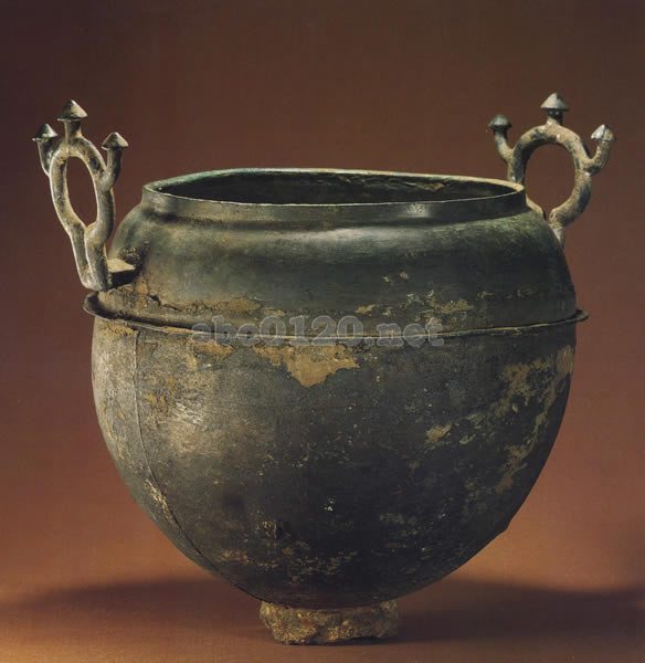 垂直の口,鼓腹,円底,小さな圏足。肩と腹の間に幅1センチの凸稜がめぐらしてある。肩部に直立した環耳が対称的にふたつあり,耳の上にそれぞれ3個の茸状の装飾がついている。独特な形状,重厚な作風である。出所:中国内蒙古北方騎馬民族文物展