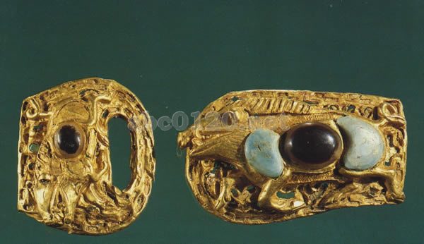 大小2個,それぞれ帯釣と帯扣。どちらも宝石をはめこんだ半浮き彫りの金猪を主体とする文様。金猪は雄と雌で,疾駆する形に作る。腹側の中央に宝石1個が象嵌され,形は「猫眼」に似,その左右に三日月形の玉を象嵌している。腹,背,背中の毛にトルコ石がはめこまれているが,すでにぬけ落ちてないものもある。地の文様は浮き彫りの装飾で, ここにももとは象嵌があった。金猪は写実的,装飾は精巧で,彫金の技巧は細かく,芸術性の高い実用品である。出所:中国内蒙古北方騎馬民族文物展