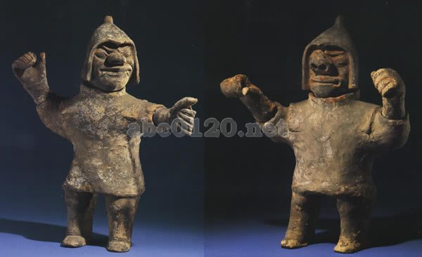 頭,手,胴体を別々に作って組合わせたもの。両眼はとび出て,眉はつき出て,大きな鼻は上を向き,口を横一文字に細くあけ歯をむき出している。盔をかぶり,丸首の半長衫を着,長靴をはき,両手をひろげて物を握つているしぐさをする。形と装束はふたつともほぼ同じで,造型は荒っぽく,誇張されている。出所:中国内蒙古北方騎馬民族文物展