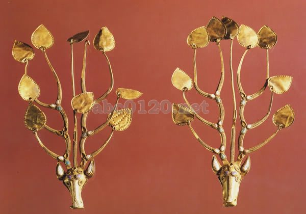 顔は馬頭の特徴を持ち,額に象嵌されていたガラスはすでに落ちている。眉の上に一対の円圏文が加えられている。すべての模様と顔の周囲に魚子文が飾られているほか,顔に,白と薄い藍色のガラスが象嵌されている。耳はとがった桃形をし,その内側に薄いわ桃色のガラスが象嵌されている。角は3本の枝が並んで伸び,分かれ目に緑色と薄い桃色の桃形のガラスがはめこまれている。枝の先に桃形の金葉が1片ずつ付けてある。 2点とも金菓がもと10片あつたが,いまはそれぞれ1片が落ちている。出所:中国内蒙古北方騎馬民族文物展