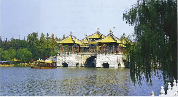 五亭橋は痩西湖にまたがる石橋で、清の乾隆22年(1757年)に建てられ、高さ5.8m、長さ58m、幅18.6m。橋の上に5の亭が立ち、真ん中の亭が一番高く、南北側の2亭が対称的に立っている。五亭橋の構成が巧妙、造形がユニークで、揚州のシンボルとなっている。