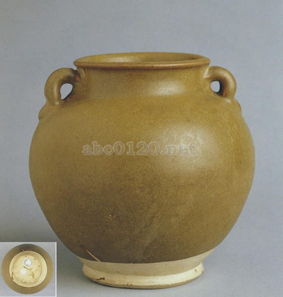 端反りとなった口縁部と高台、二つの小さな耳が肩についた胴の丸い壺。淡黄色の胎にくすんだ感じの「茶葉末」タイプの失透性の褐色の釉がかかり、ところどころに緑色の斑点があらわれている。高火度釉のため酸化鉄が飽和状態となるのである。この形は唐時代によくみられ、このような釉もこの頃から北や南の広範囲にわたって使われ始めた。釉が裾にかからないのもこの時代の特徴である。同様の器は唐時代に北で生産され続け、その技術は未時代と元時代の磁州窯に影響を与えた。これらの壺は日用品で、貯蔵用として以外は宮廷では見られない。出所:中国陶磁の至宝-デイヴィッド・コレクション