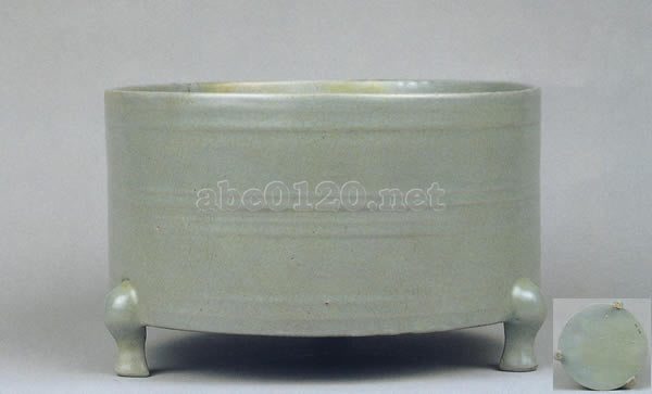 筒形の胴に小さい馬蹄形の三本の足をもつこの器形は、漢代の銅器か漆器を模したものである。胴部には漢代の銅器の弦文を写したような七本の突帯がみられる。汝窯の特色である細かい無数の貫入で覆われた灰青色の釉が厚く均等に施され、器底には小さな五つの目跡が円形にめぐっている。このタイプの破片は清涼寺村の汝窯の窯址から発見されているが、出土例は極めて少ない。台北の故宮博物院にこれと類似した作品が収蔵されている。北宋時代の徽宗帝は収集した古銅器などを図録、宣和博古図にまとめさせたが、これが陶磁器の器形に影響を与えたといわれている。出所:中国陶磁の至宝-デイヴィッド・コレクション