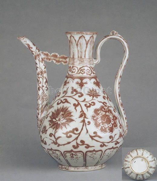 腰がゆったりと張った玉壺春瓶に、長く湾曲した把手と長く伸びた注目がつく水注。胴の下部から伸びた注口には、頸部との間に装飾と補強の役割をもつ雲形のつなぎが泣るが、総体は金属器の水注を模倣したものと思われる。把手の上部につく小さな輪形は蓋を鎖で結ぶためのものだが、今では蓋は失われている。この形式の水注はイスラム圏からもたらされた金属瓶に倣って元時代に(訳注:明時代という説もある)景徳鎮で作られ始めた。酸化銅で釉下に文様を描き還元炎で焼成する技法だが美しい紅色の発色を得るのは非常に難しい。この水注はやや白みがかってはいるが釉裏紅はよく発色している。頭部に蕉葉文、雷文、唐草文を、胴部には主文様として花唐草文を、裾部にはラマ式蓮弁文が描かれ把手と注口にも牡丹唐草文があらわされている。全体の作調から明時代初期洪武年間の特徴的なものである。 出所:中国陶磁の至宝-デイヴィッド・コレクション