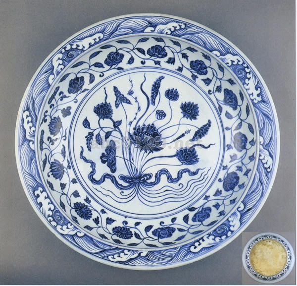 口縁を水平に広げたいわゆる鍔縁の、見込みの浅い大盤で、低い高台をもつ。きめの細かい磁胎に、やや青みがかったなめらかな透明釉が全面にかかる。見込みには蓮華や水藻などをリボンで束ねた文様、内外両側面に牡丹、蓮、菊、椿といった花卉を組み込んだ唐草文、口縁には波濤文を青花で描いている。高台内と畳付きは露胎のため薄い褐色に焼けているが、これは元時代と明時代初期の盤の特徴ともいえるものである。このような盤形はイスラム金属器の影響を受けたものと思われ、14世紀から15世紀初めにかけてイスラム圏へ多く輸出されている。この主文様は元青花にもみられるが、この作品の文様表現と形態は、明時代初期の特徴をあらわしている。出所:中国陶磁の至宝-デイヴィッド・コレクション