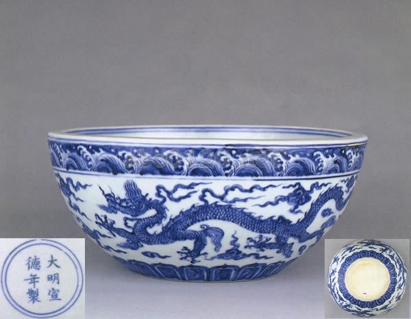 欧米で「ダイス・ボウル」と呼ばれる器形。全体が厚手の作りとなり底裏は側壁に沿って低い高台が削りだされ、そのなかはま浅く内刳りが施されている。きめの細かい磁胎に、かすかに青みがかった高火度焼成の透明釉がかかる。口縁に波濤部分を白く抜いた波濤文帯、胴に主文様として五爪をもつ双龍が霊芝雲の間を飛翔する図、裾部には蓮弁文を典型的な宣徳期の鮮やかな濃い発色のコバルト顔料を用いて濃度をつけて描いているため、重厚な印象を与える。顔料の厚く溜った部分では黒褐色の小さな斑点があらわれているが、これはこの時期に用いられたイスラム産のコバルト顔料蘇痲離青(そまりせい)が鉄の含量が多いため、焼成の具合によりこのような黒い鉄斑が生じるのである。底裏は無釉、無文。鉢の見込みに青花で二重田圏線内に「大明宣徳年製」の銘が記されている。 出所:中国陶磁の至宝-デイヴィッド・コレクション