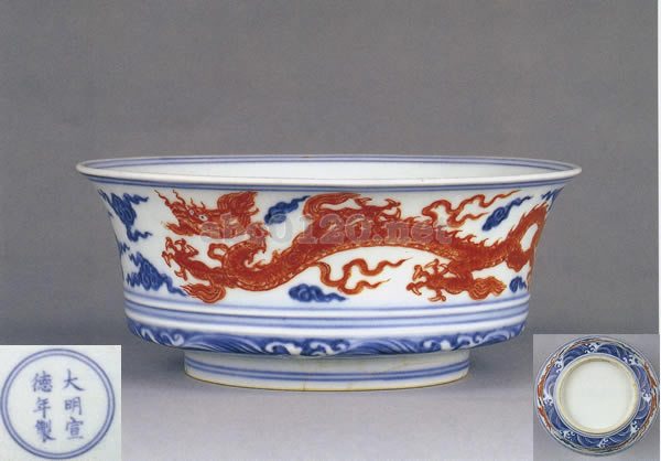 口縁が端反りし、ほぼ真っ直ぐな器壁、底部は平らとなるこの器形は金属器を模倣したものである。青花と上絵具の鉄呈色の紅彩で文様があらわされている。胴部には青花による雲間を悠然と飛翔する五爪の龍ニ体が鮮やかな紅彩で描かれ、その下に二重の突圏線、折腰部には波濤文が青花で描かれている。内面は口縁下に青花の圏線がひかれ、見込みに「大明宣徳年製」の青花銘が二重圏線内に記されている。デイヴィッド・コレクションには、この他青花のみと青花釉裏紅の技法による同形、同文様の作品がある。これらは全て甲盛りのある蓋が伴っていたと思われるが、今は失われている。出所:中国陶磁の至宝-デイヴィッド・コレクション