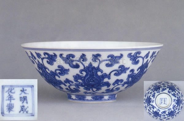これは「パレス・ボウル」と呼ばれる成化期独特の器形に属し、わずかにすぼまった小さい高台から口部までほぼ垂直にひらいた円錐形の碗形。きめの細かくなめらかな磁胎に、透明釉が均一に施されている。他のパレス・ボウルと同様、細い線で唐草の茎や花卉の輪郭を描き、淡い発色の青花が塗られている。高台側面に様式化された花文様が廻り、底裏には二重郭内に「大明成化年製」の青花銘が大る。碗内面は無文。大部分の成化期の作品は余白が多く青花文様との調和がとれているが、この碗はデイヴィッド・コレクションの他のパレス・ボウルよりも文様が緊密で、青花も灰色を帝びた淡い青色の発色を呈している。成化銘は二重圏線内か二重方部内に記されるが、二重方郭の銘は成化の豆彩磁器によく用いられている。出所:中国陶磁の至宝-デイヴィッド・コレクション