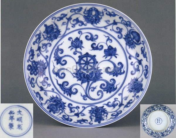 口縁が端反りとなった盤。精緻できめの細かい上質の磁胎に、かすかに青みを呈したなめらかな透明釉がかかり、器面に淡い色調の青花で文様が描かれている。見込みの主文様に法輪をのせた蓮唐草文をあらわし、それを囲むように内側面には七輪の蓮唐草文がそれぞれ七宝をのせてめぐっている。外側面は唐草文と人宝文が、高台側面には様式化された花文様が描かれている。高台内には二重圏線内に「大明成化年製」の銘が青花で記されている。この頃仏教思想にもとづく人宝文が多く用いられたが、これは成化帝が仏教を信奉したためであろう。青花の色調は淡く、筆致は繊細で伸びやかで、細い輪郭線内に淡い青の濃淡を加える表現は、成化期青花の特徴ともいえるものである。これはイスラム産のコバルト顔料に代わって国産のコバルト顔料(土青)が用いられたためとされている。他の成化磁器と同じく、この作品もかすかにクリーム色がかった精緻な素地を使い、洗練を極めた姿に仕上がっている。出所:中国陶磁の至宝-デイヴィッド・コレクション