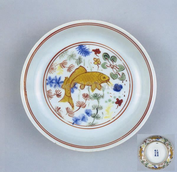 端反りの口縁とわずかに湾曲した側面、低く、すぼまった高台をもつ浅い盤。きめの細かい磁胎に高火度焼成の透明釉がかかったこの盤は、青花と多彩の上絵具で釉上に絵付けをする五彩と呼ばれる技法が用いられる。口縁下と見込み周辺に紅彩で重線をひき、その中に一匹の鯉が種々の水藻の間を泳ぐ様子があらわされている。鯉はオレンジ色を呈しているが、これは黄釉を焼き付けた上に薄い紅彩を塗り重ねて、再度低火度で焼成して得た発色で、嘉靖期特有の色とされている。他には青花、紅彩、黄、緑、紫が水藻に用いられ、外側面にも同様の配色で池の中に漂う水藻の間を四匹の鯉が泳ぐ姿が描かれている。この作品では他の五彩と比べて青花は控え目な使われ方をしている。五彩技法は明時代正徳期に発展し、明時代中後期にひろく用いられた。魚藻文は嘉靖期に多くみられる文様で、壼や盤、鉢などに類例をみることができる。底裏に青花で「大明嘉靖年製」の銘が入つている。出所:中国陶磁の至宝-デイヴィッド・コレクション