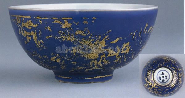 半球形で口の立ちあがる小さな碗で、高台はわずかに内にすぼまっている。精緻なつくりの磁胎に透明釉を畳付き以外の全面にかけ高温で焼成し、更に高火度コバルト釉を器の外側面にかけ再度焼成して、最後に金彩を施してある。あでやかな藍色の地に金彩で宝相華唐草文様を加えた図柄は絹織物に多くみられる。他にもさまざまな単色釉が地色として用いられているが、この様式を日本では「金襴手(きんらんで)」とよび茶人の間で特に珍重された。高台内には「長命富貴」の楷書銘が青花で記されている。これは明時代後期によく使われた銘で、この四文字は二重圏線内に古銭文のように配されている。金欄手の焼造は16世紀に盛んで、日本と中国で好まれた。