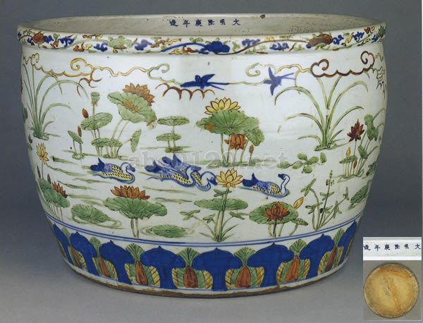 口縁端部が肥厚し、胴がわずかに張った、平底の厚手の甕。磁胎に高火度焼成の透明釉がかかる。外側面には濃い色調の青花と釉上彩の赤、黄、緑を組み合わせた五彩の手法で文様が施されている。金魚などをいれて飼うための水槽として作られたためか、水辺の文様がのびのびと描かれ、蓮やさまざまな水草を配し、鳴や鷺を描いてある。鴨と鷺と文様の一部は青花であらわし、黒い上絵具で細く縁取つた水草や道に赤、緑、黄といった彩色が加えられ、絵画的な文様となっている。口縁に霊芝唐草文、胴裾には二重蓮弁文を配す。内面は無文、口縁下に青花で「大明隆慶年造」の大字銘が横書きではいる。底裏は露胎のため赤褐色に焼けている。隆慶期は非常に短かったため官窯銘が入った作品は極めて少なく、また遺品も小品が多い。この様に大型の作品で形に歪みのないものは珍しく、この作品の焼造に携わった陶工の技量の高さがうかがえる。