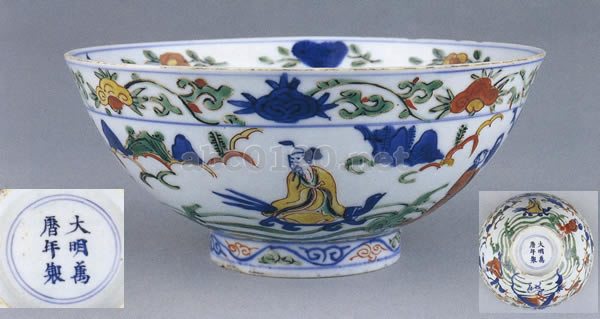 口縁がわずかに端反りとなった深鉢で、高めの高台も外反りとなる。磁胎に高火度焼成の透明釉がかかったこの鉢は、青花と多彩の上絵具で釉上に絵付けをする五彩で文様があらわされているが、これは15世紀初期にはじめて用いられた豆彩から発展したものである。内面見込みには16世紀の官窯の特徴である大きな角のはえた頭を正面に向けた五爪龍が、重圏内に青花と上絵付けの赤とで描かれ、口縁内部は様式化された花文様帯がめぐっている。口縁外部は長寿の象徴である霊芝唐草文、側壁は亀や鶴に乗って飛翔する仙人が、高台には唐草文を赤、黄、緑、紫などの華やかな五彩と青花で描かれている。上絵付けの部分は青花で輪郭をとる代わりに赤や黒で縁取られ、青花は器面を飾る文様の色彩の一つとなっている。底裏は二重圏線内に「大明萬暦年製」の銘が青花で記されている。