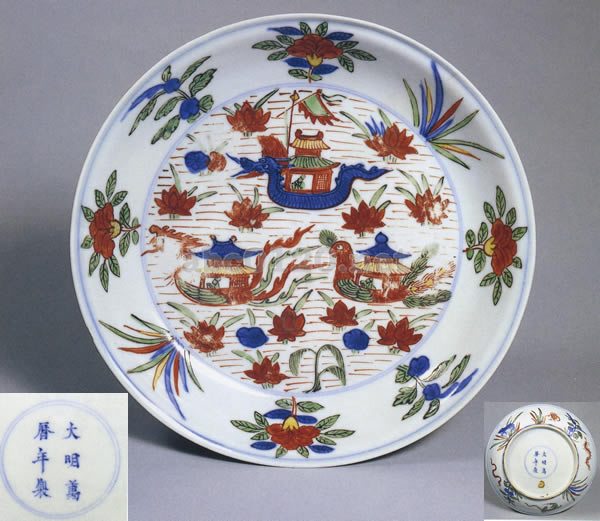 端反りの口縁、湾曲した側面に低く広い高台のつく浅い盤。磁胎に高火度焼成の透明釉がかかり、青花と釉上彩の赤、黄、緑などを組み合わせた五彩の手法で文様があらわされている。内面見込み一面に初夏に毎年開催される「龍舟競技」の一場面が描かれ、龍や鳳凰をかたどった三艘の舟が蓮などの水草の間をぬって進む様子が、五彩でのびのびと華やかに表現されている。内側面は折枝文が、外側面には蛙、蛇、 トカゲ、百足、サソリなどがあらわされる。底裏は二重圏線内に「大明萬暦年製」の銘が青花で記されている。中国南部で毎年行われているこの豊穣を願う祭事で使われる龍舟は、ここにみられるように伝統的に龍をかたどった細長いデザインに作られる。