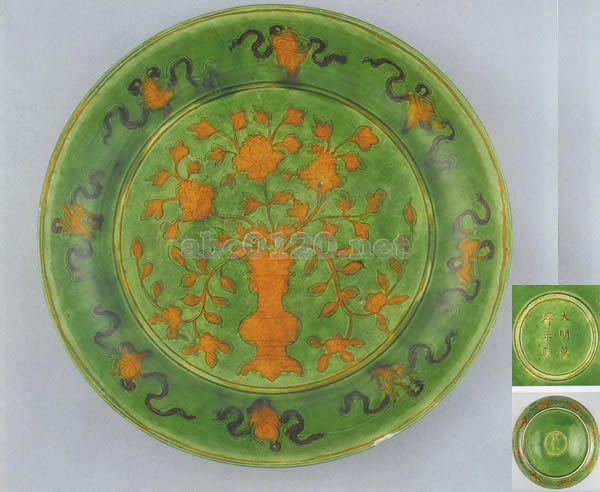 端反りの広い口縁とわずかに湾曲した側面、低くすぼまった高台のつく浅い盤。生乾きの磁胎に線刻で文様を施し、高火度で焼締め、緑と黄と紫の鉛釉で全面を彩色してから再度焼成する素三彩の手法。内面は緑釉を地に施し、見込みには花瓶と生けた花に黄釉を塗り、内側面には八宝文に黄釉を施し紫でリボンを描いてある。外側面は同様に緑釉を地に施し、如意頭形の文様に黄釉が塗られる。高台内には緑釉が全面にかかり、線刻された二重圏線内の「大明萬暦年製」の銘は黄釉であらわされる。この「素三彩」と呼ばれる装飾法は、15世紀初期、正徳年間頃に景徳鎮ではじめて用いられた。