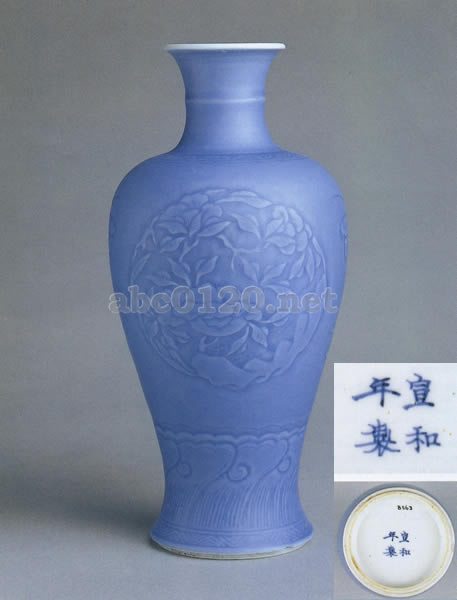 精緻な磁胎に、高火度焼成のやわらかいコバルト・ブルーの単色釉がかかっているが、口縁と内面には透明釉がかけられている。頸に一条の弦文、胴部に椿と蓮を構成した団花文、胴裾には様式化された蓮弁風の波文様が刻されている。胴の団花文の間には、長寿のシンボルとされる蝶と霊芝があらわされている。底裏には透明釉がかかり、畳付は無釉で、きめの細かい白い素地をみせる。高台内には青花で「宣和年製」のl楷書銘が記されているが、康熙年間の陶磁器には、しばしば古い年代銘が入れられている。出所:中国陶磁の至宝-デイヴィッド・コレクション