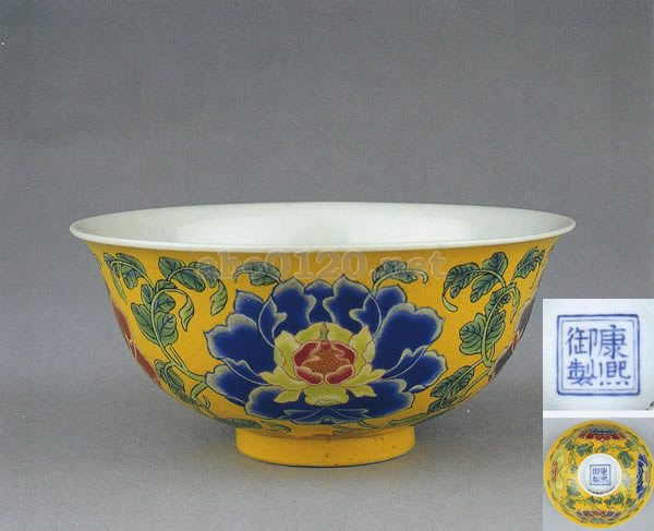 口縁がわずかに端反り、まるみのある曲面をもった碗で、垂直の高台がつく。白くきめの細かい半透明の磁胎、内面と高台内には透明釉がかかっている。外側両は地に皇帝の色である黄色を塗りこみ、強い色調の紅、青、緑、オレンジ色の不透明な顔料で、四つの牡丹唐草文様を鮮やかにおいている。底裏には「康熙御製」の銘が藍料で二重の方郭内に記されている。このようにガラス質の粉彩顔料で銘を記した作品は、康熙、雍正年間に景徳鎮の御器廠で焼かれた極上の白磁を、紫禁城内に設けられた内務府造辦処の琺瑯作で絵付けされたものであることを示している。ここに用いられた黄色の顔料は、清時代にはいってから始まった酸化アンチモニーの呈色により得られる低火度黄釉である。出所:中国陶磁の至宝-デイヴィッド・コレクション