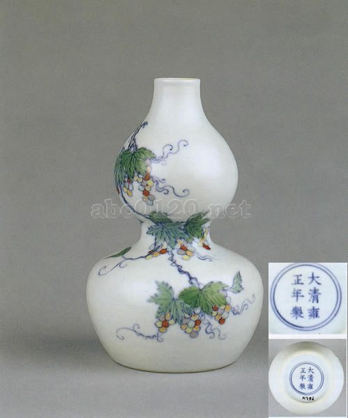 瓢箪形の小さな瓶。優美な曲線につつまれたこの瓶は、精緻な磁胎に高火度透明釉を施し、青花で文様の輪郭と細部を細い線で描いて、釉上に彩色を加える豆彩(闘彩)の手法が用いられている。実をつけた葡萄が口縁下から胴裾まで、ななめに絡まるようにあらわされ、裏面には葡萄を食べるリスが捕かれており、余白を生かした文様配置となっている。絡み合った蔓は細い青花の線であらわされ、淡い紫、緑、黄、赤で葡萄の実を、濃度をつけた緑色で葉を彩ってあり、これらの透明で淡い色調は純白の美しい磁胎によく映え、全体に瀟洒で洗練された作調となっている。底裏には青花で「大清雍正年製」の銘が二重圏線内に記されている。明時代の成化年間に豆彩の手法は完成されたが、清時代の雍正年間になると、磁胎は純白のさらに精緻な薄作りとなり、文様の描法は繊細さ、丁寧さをます。上絵具も色数が豊富となり透明さをまし、成化豆彩に優るほどの作品が作られるようになった。景徳鎮官窯で生産された雍正年間の磁器は、最高峰を極めた作品といえるであろう。出所:中国陶磁の至宝-デイヴィッド・コレクション