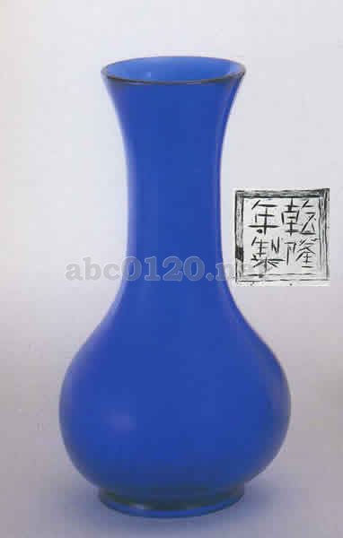 乾隆年製銘 1736~95年 高26.7cm 下部は球根形で、大きなラッパ形の頸と凹んだ円形高台が付いている。細長い気泡がある。底には、「乾隆年製」銘が二重の枠内に彫られている。出所:清朝のガラス1644-1911R・Hクラーグ・コレクションサントリー美術館 関連用語: