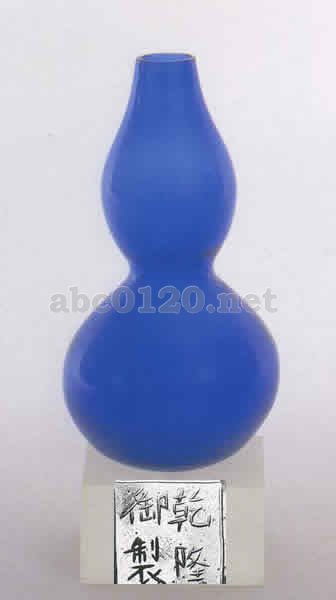乾隆御製銘 1736~95年 高23.5cm 瓢筆形の瓶で、なだらかな先細の頭が付き、底は浅く凹んでいる。透明な藍色ガラスは気泡でおおわれている。底には「乾隆御製」銘が、一重の枠の中に彫られている。出所:清朝のガラス1644-1911R・Hクラーグ・コレクションサントリー美術館 関連用語: