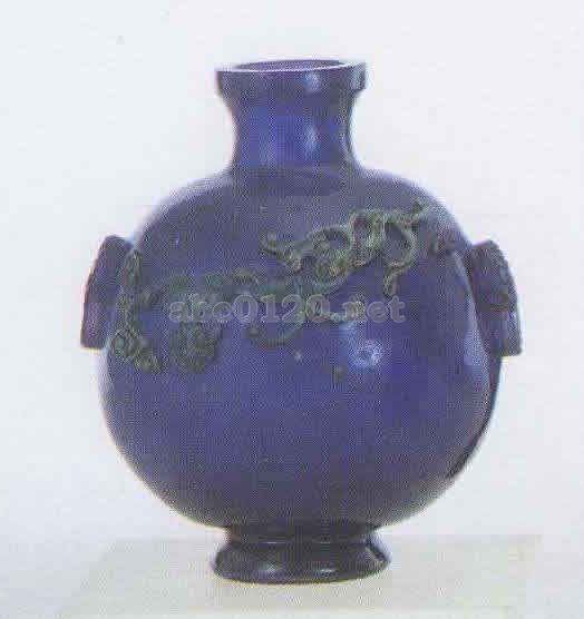 短い頸と、低い付高台のある球形の壺。胴部に融着して彫刻したアメジスト色ガラスは饕餮文で、鐘の把手を模している。孔雀石を模した縞目緑色ガラスは、霊芝雲をつかんでいる雨竜を表わしている。まばらな気泡と不純物が至る所にある。出所:清朝のガラス1644-1911R・Hクラーグ・コレクションサントリー美術館