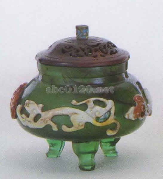 三本の猫脚付香炉。胴に融着して彫刻を施したガラスは、霊芝雲の間の三匹の雨竜を表わしている。透明な緑色の厚い胴には、黒い縞高がある。融着ガラスは、透明な赤・乳白色・茶・黄が混ざり、比較的厚い。木製の透し彫りの蓋には、七宝の摘が付いている。出所:清朝のガラス1644-1911R・Hクラーグ・コレクションサントリー美術館