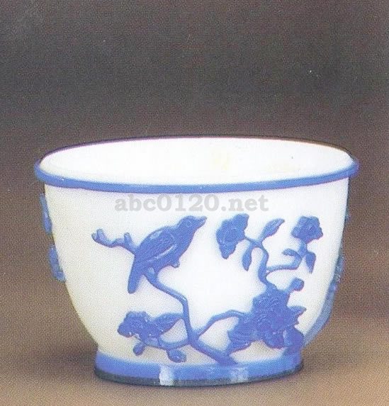 19世紀前半 高7.3cm 円形高台は低く、胴の被せガラスには小鳥・梅・椿がくっきりと彫刻されている。被せガラスの輪が口辺を取り囲んでいる。胴は、比較的厚い。出所:清朝のガラス1644-1911R・Hクラーグ・コレクションサントリー美術館 関連用語: