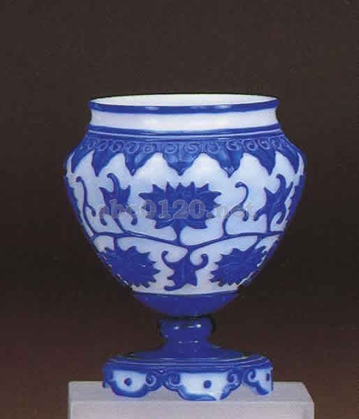 口が広く、短い脚の付いた卵形の鉢。脚は、帯状の如意頭文の上に立っている。乳白光を発する胴は非常に薄く、被せガラスには宝相華文と、如意頭文の縁取りがある。出所:清朝のガラス1644-1911R・Hクラーグ・コレクションサントリー美術館