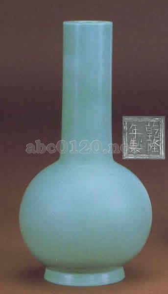 乾隆年製銘 1736~95年 高21.0cm 頸は円柱形で、裾広がりの円形高台が付いた球形の瓶っ表面は丁寧に研磨されており、黒く細かい不純物が見られる。底には、二重の枠の中に「乾隆年製」銘がある。出所:清朝のガラス1644-1911R・Hクラーグ・コレクションサントリー美術館 関連用語: