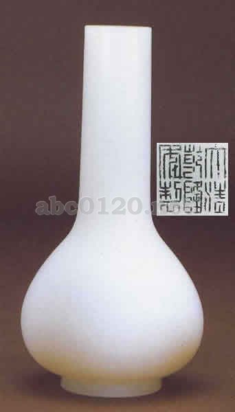 大清乾隆年製銘 19世紀前半 高24.1cm 長い円柱形の頸と、低い円形高台が付いた洋梨形の瓶。胴は部厚く、乳白光を発している。底には、篆書で「大清乾隆年製」銘が刻まれている。出所:清朝のガラス1644-1911R・Hクラーグ・コレクションサントリー美術館 関連用語:
