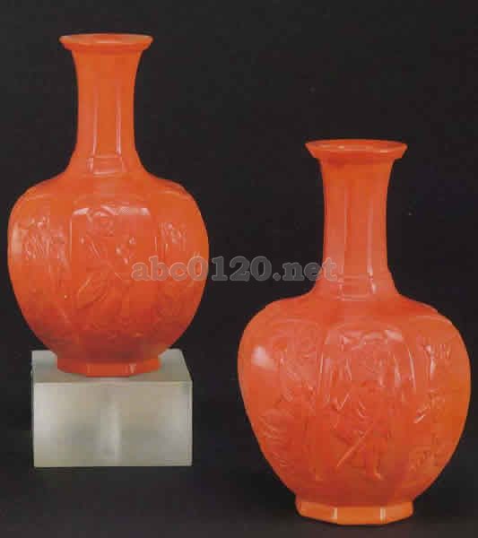 19世紀後期 高22.5cm 胴は八角形で丸く、ラッパ形の頸の口縁は反り、広い底は少し凹んでいる。枠の中に八人の道教の仙人が、彫られている。出所:清朝のガラス1644-1911R・Hクラーグ・コレクションサントリー美術館 関連用語: