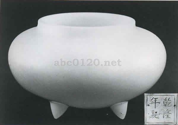 乾隆年製銘 1736~95年 高8.9cm 円錐形の高台が三個付いている円形香炉で、胴にはまばらな気泡と、小さな不純物がある。底には「乾隆年製」銘が、二重の枠の中に刻まれている。 出所:清朝のガラス1644-1911R・Hクラーグ・コレクションサントリー美術館 関連用語: