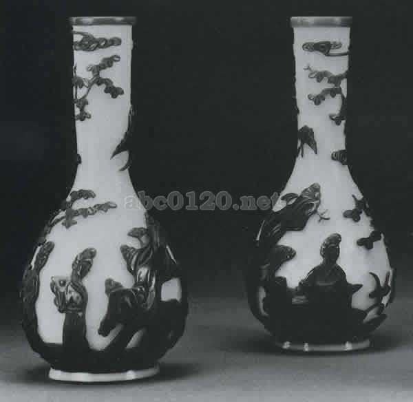 一対の洋梨形瓶で、やや裾広がりの円形高台か付いている。透明な紅色被せガラスには、楽器を演奏したり、踊ったり、お茶を出している二人の女性が彫られている。庭には、岩・桐・蝶・霊芝雲・菊が配されている。出所:清朝のガラス1644-1911R・Hクラーグ・コレクションサントリー美術館