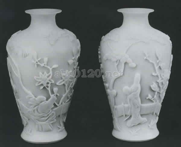 19世紀後半 高21.6cm 中位の厚さの梅瓶形の瓶で、松・柳・木蓮・梅と庭の中の女性が彫られている。出所:清朝のガラス1644-1911R・Hクラーグ・コレクションサントリー美術館 関連用語:
