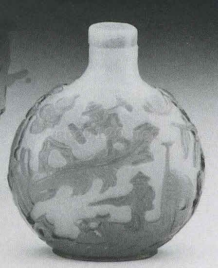 偏平な丸い壼で、楕円形の被せガラスの高台が付いている。楼閣と学者・水牛と牧夫・漁師と横などが、薄い被せガラスに彫られている。出所:清朝のガラス1644-1911R・Hクラーグ・コレクションサントリー美術館