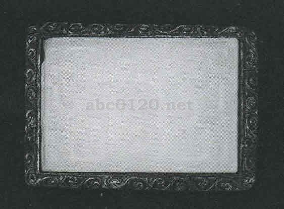 古風なベルト用バックルで、寿の字が二匹の蝙蝠と、二個の様式化された竜繋ぎの幾何学文の間に配され、浅い浮彫で彫られている。金銅製の枠が付いている。出所:清朝のガラス1644-1911R・Hクラーグ・コレクションサントリー美術館
