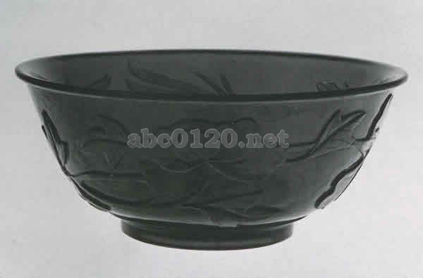 18世紀 径16.0cm やや透明度の高い藍色の鉢で型吹きである。牡丹に鳳凰文様を彫琢。出所:清朝のガラス1644-1911R・Hクラーグ・コレクションサントリー美術館 関連用語: