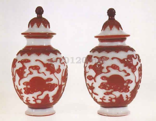 乳白色の地に、ややローズ系の紅色ガラスを厚く被せた一対の壺。身の内部は凹凸が残っている。底面内側の中央部は、山形に盛り上っている。被せられた紅ガラスは、楼閣・松喰鳥・竜・太陽・瑞雲・麒麟・蝙蝙・松・璧玉などまことに多彩である。火焔状の玉を追う竜の図は、陶磁器にもみられる。高台、及び蓋の摘は、別に融着されたもので、摘の部分は更に花弁形に彫刻されている。出所:清朝のガラス1644-1911R・Hクラーグ・コレクションサントリー美術館