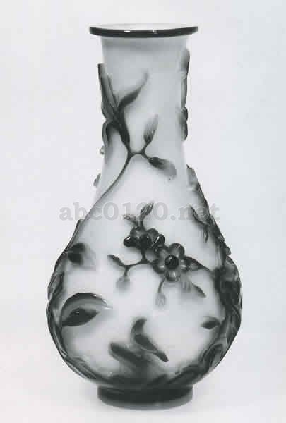 乳白色地にまず桃色を被せ、更にその上に緑色を被せて文様を彫琢したもの。伸びやかな百合の花文様などには、アール・ヌーボー期のガラスに通じるものがある。