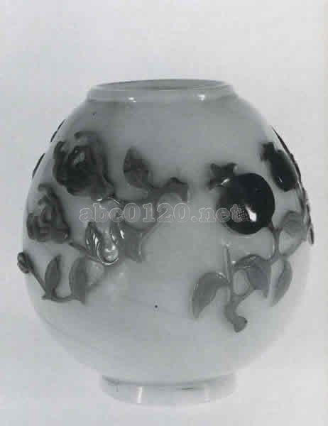 白地にザクロの実・仏手柑・蝙蝠などを、紅色・濃青色・黄褐色などの色ガラスを融着してその後彫刻して表現したもの。出所:清朝のガラス1644-1911R・Hクラーグ・コレクションサントリー美術館