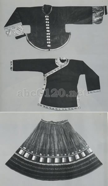 チワン族の女性はまた刺繍も上手で,ふつう手織り,手染め,手縫いの胸あて,靴,帽子,子供用のおくるみなどに,色絹糸で鳥獣,人物,草花,折り枝などの図柄を刺繍する。模様は手のこんだ美しいもので,色彩はあざやかであり,真にせまっている.これらの手工芸品はいまでも民間に広く伝えられており,彼女たちはろうけつ染めと刺繍を組み合わせて美しいスカートを仕立てることもある。出所:中国民族服飾1981