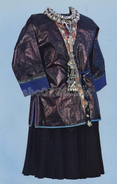女性のスカートには季節にかかわりなく,黒がよく使われている。色の組み合わせにはとても気をつかい,先にあげた四色の一つを基調にもう一つの同系色を配し, さらに別の対比色で飾りをつけ,配色の主従がはっきりしている.このため全体の色調が明快で, しかもしっとりと落ち着いている.洛香のトン族女性の旧正月における装いを例にとると,青い衿なしの上衣に黒いスカート,その内側に縁どりのしてあるもう一枚のスカートをはく。腰には空色の前掛けをしめ, うしろに青と白のリボンに鮮やかな赤の絹のしごき帯をたらす。赤のしごき帯は青と白のリボンによく映え,配色の妙をしめす。