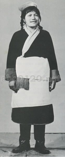 女はふだん毛の生えている面を裏にして牛皮を一枚肩にかける. さまざまな装飾品をつけるのが好きで,トルコ石と珊瑚でつくった耳飾りのほか,胸には格馬と呼ばれるいるとりどりのビーズと銀でつくったものをぶらさげる.手には腕輪と指輪をはめ,仕事をするときや外に出掛けるときは,男女とも護身,柴刈り,肉を切りさく道具として,腰に刀を帯びる。出所:中国民族服飾1981