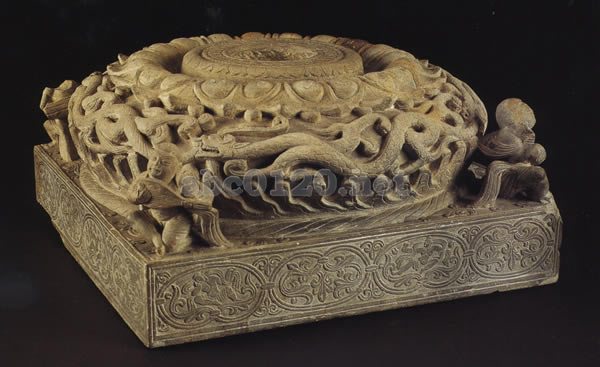 晋・南北朝|彫刻・書画|>奏楽天人龍虎蓮華唐草文柱座 |