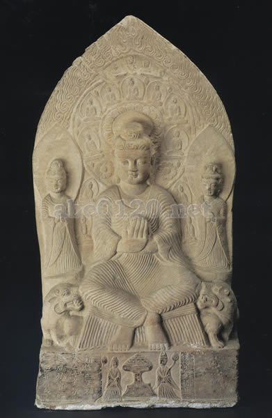 胸前で両手を重ねて両足を交差させて坐る如来の両脇に、合掌して立つ音薩と頭を振り向ける獅子とが左右対称に表現される。大ぶりの光背には、頭光部に七体、身光部に四体の化仏が表わされ、上方には比丘形の胸像五体も見え、外周に火焔文がめぐる。下端前面の香炉両脇に立つ男女の供養者像は、銘文にある二人の発願者(劉保生と王媚姜)の姿に見立てられたものかもしれない。密に連なった衣文の表現には、地域的な作風が示されるとともに、景明・正始年間(五〇〇~五〇八年)の青銅仏とも近似する要素がある。おそらく四面仏像龕に続く時期の制作と思われるが、ふくよかな顔形や力強い獅子の表現には、なお古様が温存されている。鋭く的確な彫技に裏付けられた端正な仕上りからは、工人の練達した技量のほどがうかがわれよう。