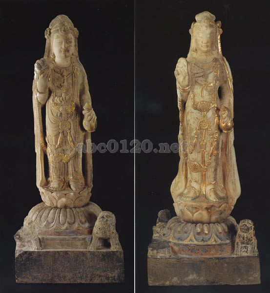 同じ場所から農民によって偶然発見された二躯の観音菩薩立像の内の二躯。いずれも像と台座が別材で作られるが、全体はおよそ同形式になる。