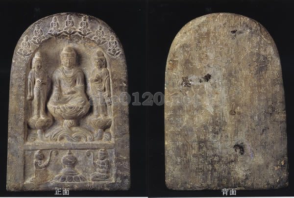 【銘文】「清信弟子骨二娘敬造阿弥陁像観音/大世志菩薩多心経一巻又造七佛上為(以上向って右側)/皇帝合家大小及六親奮属無諸欠(災)障/神龍元年十二月甘三日敬造(以上向って左側工(正面左右刻銘)/(背面に『般若心経』の経文を刻出)出所:唐の女帝・則天武后とその時代展1998